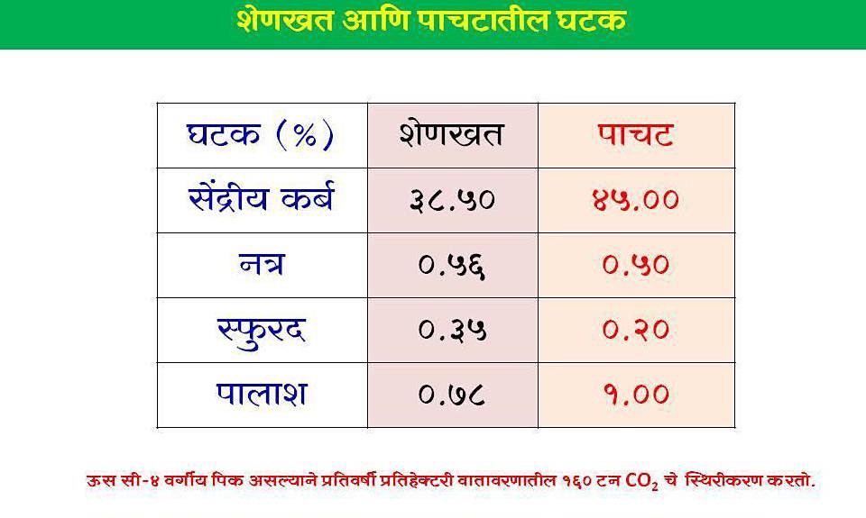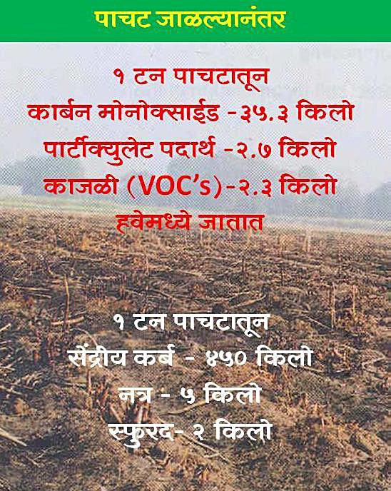 • एक टन पाचटापासून ४५० किलो सेंद्रिय कर्ब, ५ किलो नत्र, 2 किलो स्फुरद 3 ते च 4 किलो पालास मिळतो. म्हणून पाचट न जाळता कुजविणे शेतकऱ्याच्या हिताचे आहे, शिवाय पर्यावरणाच्या दृष्टीनेही महत्त्वाचे आहे.